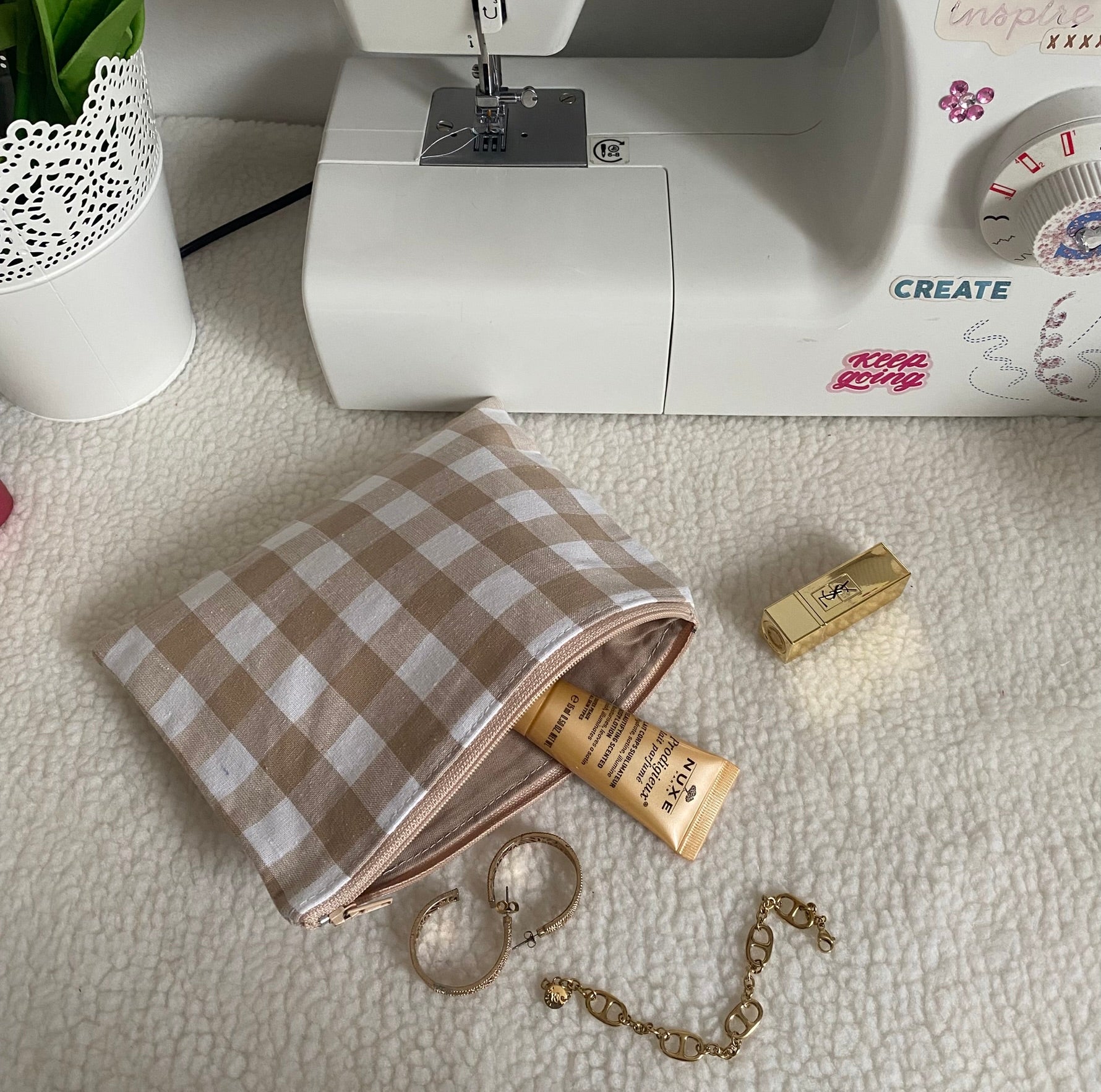 - Pochette en tissu vichy beige