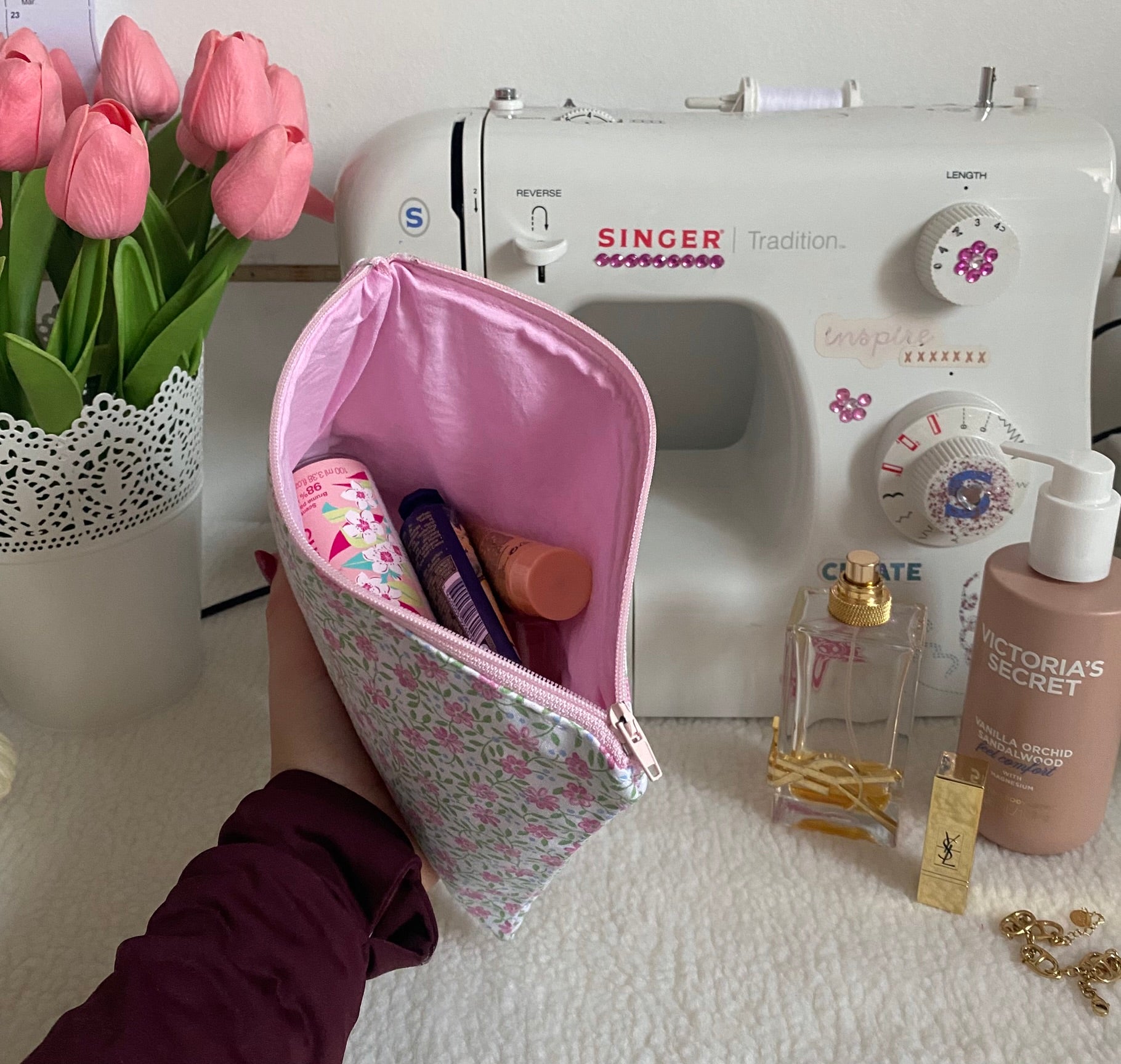- Doublure : tissu en coton rose clair uni