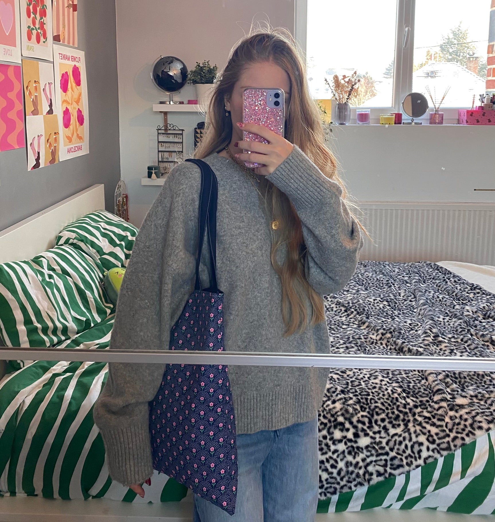 - Totebag réversible bleu marine avec un motif fleuri rose clair